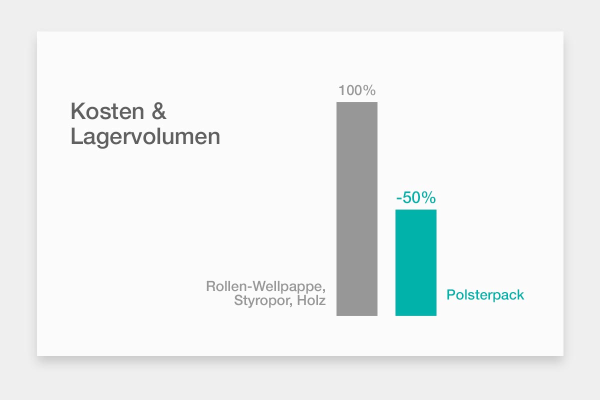 Andere Stoffe wie Rollen-Wellpappe, Styropor oder Holz sind in der Regel deutlich kostenintensiver als Polsterpack. Neben dem Kostenfaktor können Sie mit Polsterpack auch das Lagervolumen gegenüber Rollen-Wellpappe um 50% reduzieren.